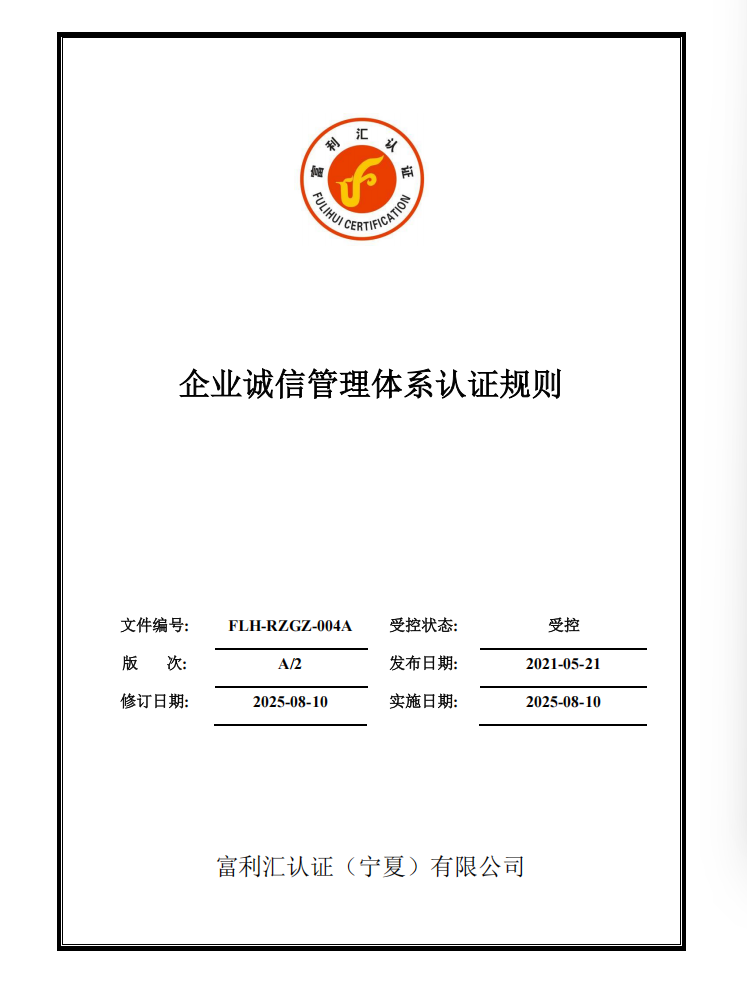 认证规则:FLH-RZGZ-004A 企业诚信管理体系认证规则 点击打开查看(全文)